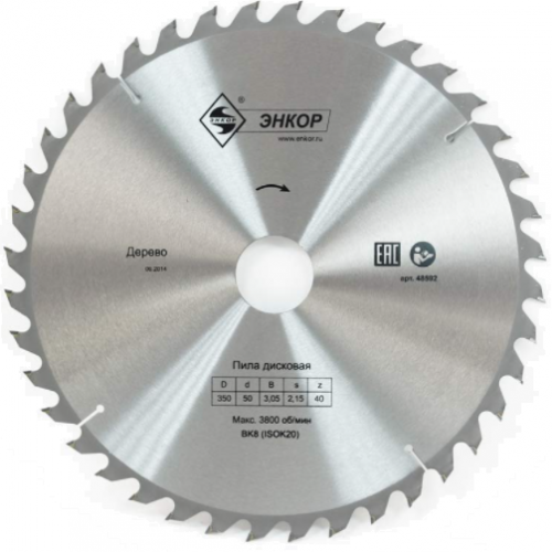 Диск Энкор 48600 является сменным элементом для торцовочных и циркулярных пил. Применяется для быстрого реза по мягкой и твердой древесине. Корпус диска изготовлен из инструментальной стали, а напайки выполнены из твёрдого сплава ВК8. Оснастка имеет зубья переменной формы. Упаковка — индивидуальная картонная коробка.