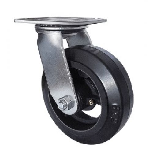 Жесткая литая резина, большегрузная, с низкой остаточной деформацией и хорошей стойкостью к износу. Литой чугунный обод, долговечный и прочный. Роликовый подшипник в ступице, с высокой несущей способностью и сопротивлением осевым нагрузкам.