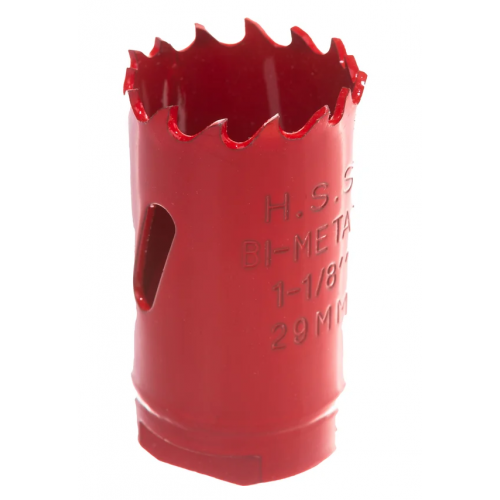 Диаметр пилы кольцевой биметаллической составляет 29 мм. Пильное полотно выполнено из быстрорежущей стали HSS, имеет разведённые зубья. Пила имеет глубину сверления до 38 мм.
