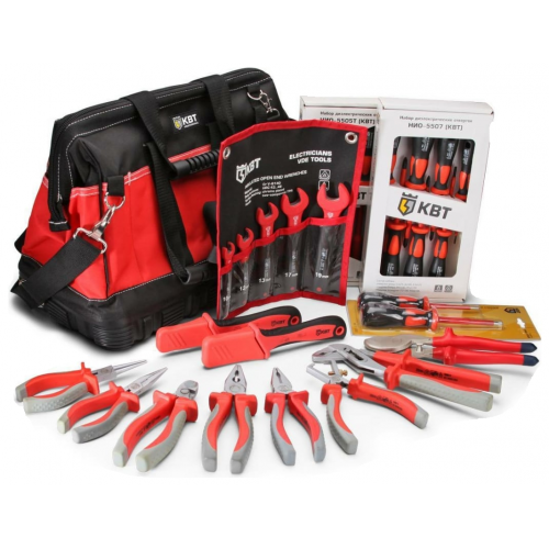 Набор электромонтажника КВТ НИЭ-04 1000 вольт предоставляется в сумке с резиновым дном, которая имеет большое количество отделений, ручки и наплечный ремень для транспортировки. Комплект состоит из большого количества инструментов, обладающих диэлектрическим покрытием, что позволяет использовать их под напряжением до 1000 В. Рабочие части изготовлены из высокопрочного материала. Двухкомпонентные рукоятки обеспечивают комфорт удержания изделий.