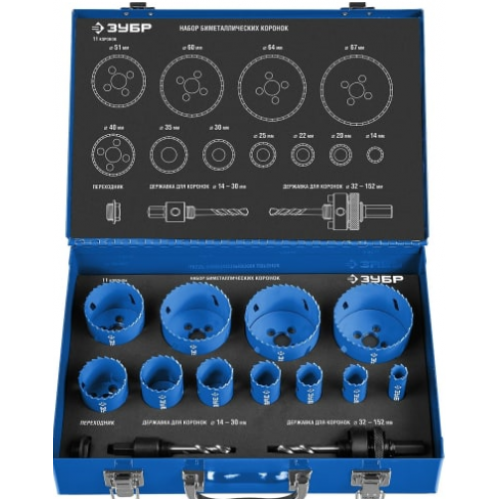 Набор коронок биметаллических ЗУБР служит для сверления металла, дерева, ДСП, гипсокартона и твёрдых пластмасс. Используются на дрелях, легких перфораторах и стационарных станках в режиме безударного сверления. Универсальные биметаллические кольцевые пилы ЗУБР имеют разведённые закалённые зубья повышенной твёрдости с прогрессивным расположением. Компенсационные прорези в корпусе обеспечивают снижение шума при работе, а также предотвращают деформацию пилы вследствие перегрева изделия. Весь набор уложен в алюминиевый кейс, который повышает удобство хранения и транспортировки.