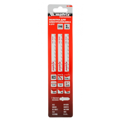 Полотна для электролобзика по дереву T744D Matrix 78223 с шагом зубьев 4 мм, из стали HCS, 3 шт. в упаковке, имеют рабочую длину 155 мм и предназначены для грубой быстрой распиловки древесины, пиломатериалов, ДСП толщиной от 5 до 135 мм, а также пластика и фанеры. Благодаря Т-образному хвостовику полотна совместимы с большинством электролобзиков ведущих производителей. Подходят для профессионального использования, будут полезны и в быту.