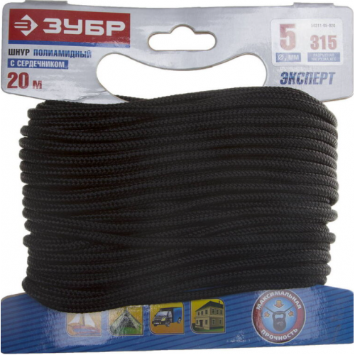 Шнур полиамидный 5мм*20м с сердечником для повышенных нагрузок черный ЗУБР 50311-05-020